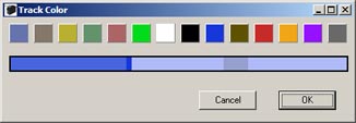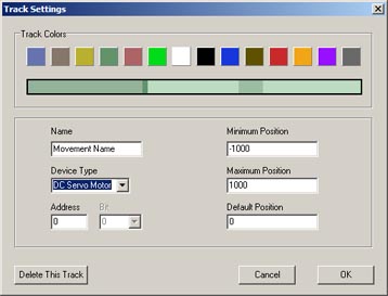 August 28 Today little issues concerning the cursor were ironed out before work started on the track colors window. It the process of working on it, it became the track settings window. This brings together all track configuration settings into one interface. It is now partially linked to the animation tracks. If you double click on an animation track's left side where it is displaying info about that track it will bring up the track settings window. Currently, you can change the track colors, rename the track, and change the track's movement type. Tomorrow, all of the rest of the features should be linked up. I don't really like how the track colors turned out. I think that I am going to reduce the number of colors used to three instead of four and maybe only to one. Perhaps I will leave that to the beta testers to decide.