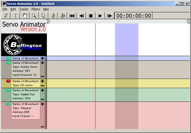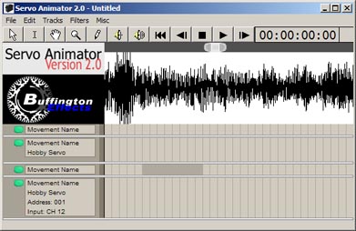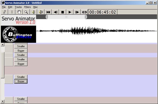 August 8 It turns out that the code that was written for the sound waveform was a Visual Basic mockup to test some functionality features. After showing the new waveform graph to some people it was determined that the slider at the top was not intuitive enough so more code was added to add little handles to it. Now its function is clearer. Work is still continuing on making it display sound waveforms. If you would be interested in beta testing or have suggestions, comments, or feature requests, please contact us. August 5 It was discovered that the code that was written previously for the sound waveform graph has gone missing. It has been a while since work has been done on this program. The previous version had some code that was a little confusing to work with anyway. Learning from past mistakes, this new version will be better. Since Monday, work has been done on the new waveform graph. Most of it has been about the small slider at the top of the graph that allows the user to zoom in and out as well as pan through the sound. All of the internal structure for the waveform graph is now in place and it is ready for code to be added that will actually draw the waveform. After that is done then a cursor will be added, we'll make the waveform graph able to play its sound, and the SMPTE timer and waveform graph will be linked so that the SMPTE timer will show the current play location of the sound. August 2 2004 Work has started again on Servo Animator 2.0 after a long delay. The screenshots shown on this page are actually Photoshop files that mock up the interface but now the main interface is built and the look and feel is starting to be functional. Tracks can be added, resized vertically, and scrolled now. The timer mechanism is working and properly displaying frames or SMPTE time code. The interface takes care of the width of everything properly when the window is resized. Code is written that is almost correctly drawing the sound files when they are loaded. It won't be long before there is some real animation functionality implemented. Our goal is to get at least the hobby servo control working by the end of October. Shortly afterwards will follow support for the digital portion of the Buffington Effects Hobby Servo Controller DC servo motor controller, stepper motor controller, and the audio playback controller. |