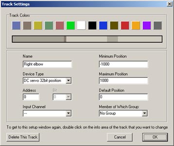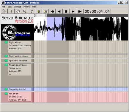 Servo Animator 2.0 is currently being written (as of this update on 9/5/04) and will be a major upgrade to Servo Animator and will be targeted at professional level productions. It will take advantage of all of the new control electronics that are listed on this site. It will get rid of the on-screen sliders that are in version 1.2.1 of Servo Animator and will replace them with animation tracks that show the shape of the animation's waveform. This will allow users to fine tune their animations. Servo Animator 2.0 take input from a joystick or your own custom waldo. This program will allow users to change the frame rate of the animation if they desire or even to sync to an external SMPTE device. There will be filters available that allow you to do such things as smooth or sharpen the animation waveforms, automatically create animation based on sound volume which will make animating mouths easier, amplify and offset the animation's waveforms to adjust to changes in your animatronic's linkages. Servo Animator 1.2 supports only hobby servos but Servo Animator 2.0 will allow you to animate hobby servos, DC servo motors, on/off devices, MIDI devices, stepper motors, dimmable lights, and much more. Below are some screen shots from the new version. For information about the current progress of this program, Click Here ![]() This is the main interface. ![]() Here is an example of what one of the filters looks like. ![]() You can change the frame rate and number of frames in the Project Settings form. ![]() You can change the functionality of an animation track in the Track Settings form. |
